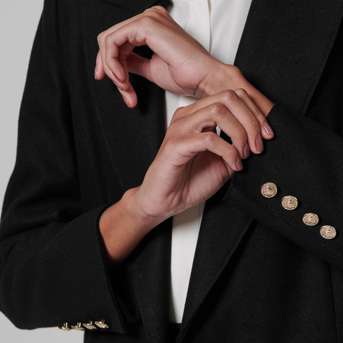 Crafted with a colour-block design throughout, this Virgin Wool blend coat has been designed with a soft touch blend perfect for the warmer months. Adorned with a lapel collar, gold-button fastening to the front, two pockets and a split hem to the back for everyday comfort. Made from 75% Virgin Wool and 25% Polyamide.